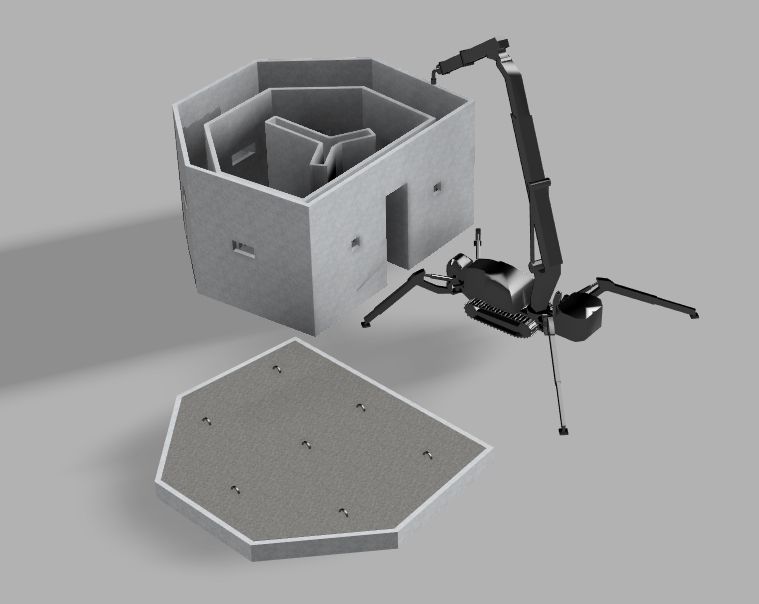 Chaque pièce a été imprimée sur place, en conditions réelles, sur un terrain non nivelé initialement, à l’aide d’un radeau imprimé permettant de rétablir la planéité. Les voûtes et les tunnels ont été coulés dans un second temps, pour tester leur résistance structurelle à cœur.