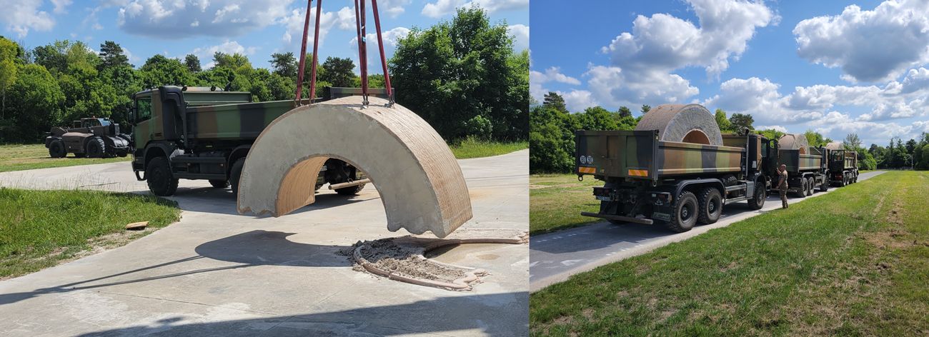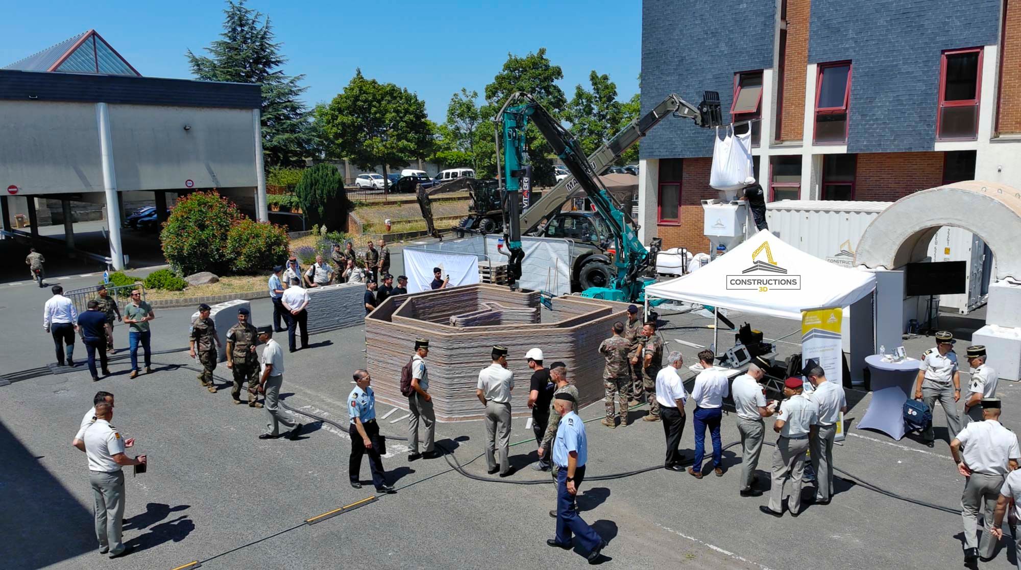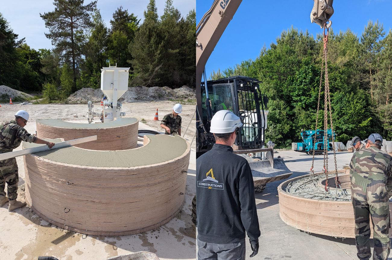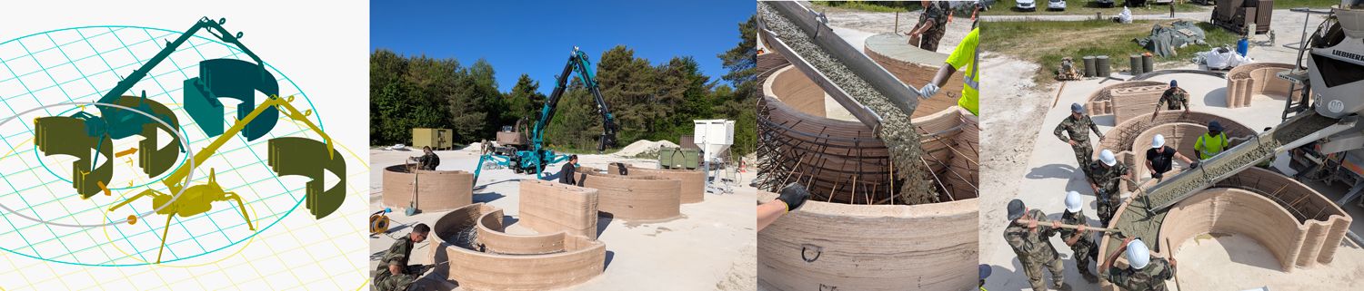 Dans un contexte où l'armée française explore activement les nouvelles technologies pour renforcer sa résilience opérationnelle, Constructions-3D a été sollicitée afin d’évaluer la technologie de l’impression 3D lors d’une EVTA (évaluation tactique) conduite par la section technique de l’armée de Terre (STAT). L’objectif de cette EVTA était d’apprécier l’intérêt de la technologie d’impression cimentaire 3D dans les domaines de l’appui au déploiement, de la contre-mobilité et de la sauvegarde-protection. Dans le cadre de l’EVTA, notre entreprise a également participé à « Dantzig », la fête du Génie à Angers, réalisant une démonstration d’impression 3D béton en live d’un abri de la seconde guerre mondiale. « Dantzig » est une occasion particulière durant laquelle sont présentées les innovations du Génie, en cours ou à venir. Cette collaboration inédite a permis d’initier une montée en compétence rapide des équipes militaires et structurelles sur le terrain et d’ouvrir des perspectives concrètes d’application pour les forces armées.