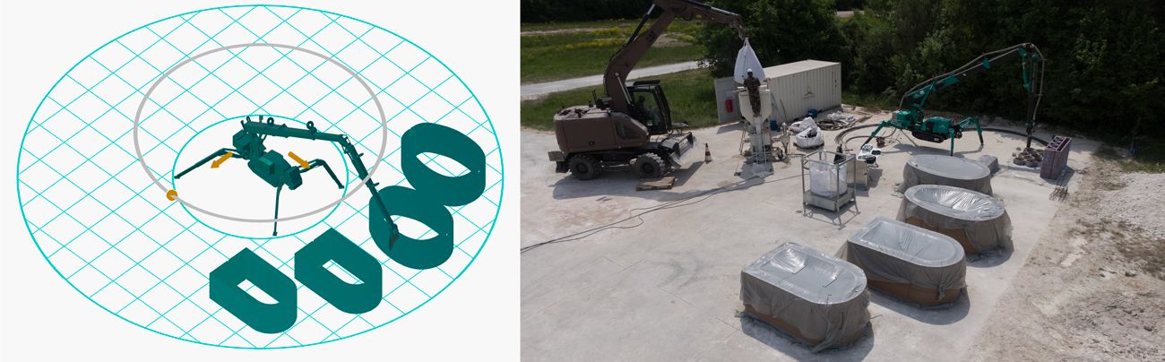 Le coulage à haut débit de plusieurs mètres cubes de béton par voûte a été réalisé sans provoquer d’effondrement ni de déformation des modules. Enfin, des tests de résistance menés après impression ont confirmé la résistance des structures : la voûte tenait parfaitement, illustrant la viabilité immédiate des pièces imprimées en conditions réelles.